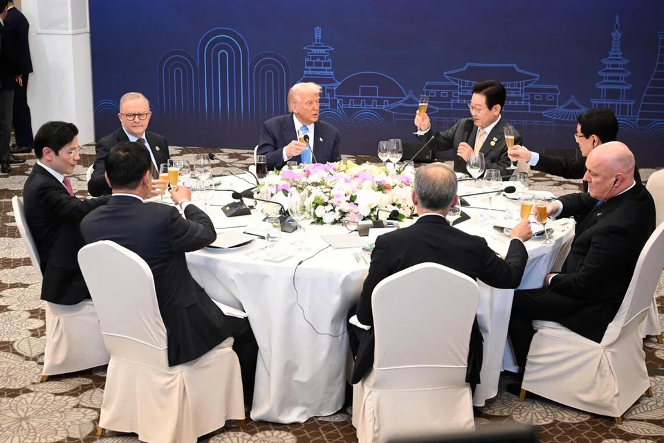 lol .. Carney, holding up glass in toasting gesture; not even looking at Christopher Luxon but looking at PDJT and South Korean President Lee Jae Myunhttps://cassette.sphdigital.com.sg/image/straitstimes/b864e30a72ad2c8307cef8f72294d7b31e764d5bc904d6b3ff47be24aecf253b?w=900I take this back. I watched another video and Carney did turn to Christopher Luxon – the photo I saw did not show the entire process.