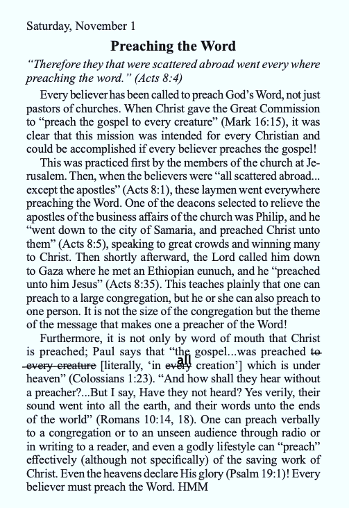 This one little correction set my mind roaming free. “to every creature” VS “in all creation”. They can mean the same thing, but they definitely have different uses.