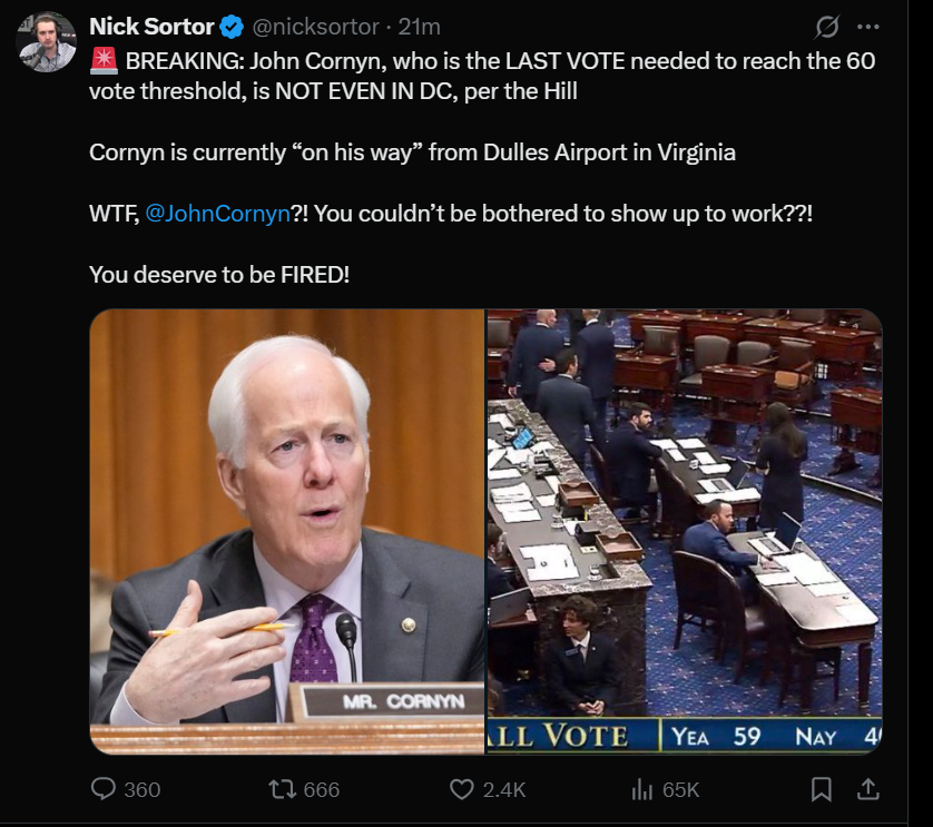 I’m certainly not a Cornyn apologist, but to claim he was a “holdout” is a false narrative. He was in flight back to DC which is why he was last. As I understand it, he arrived & was taken straight to the chamber to cast his vote. He was never considered a NO vote on this bill.