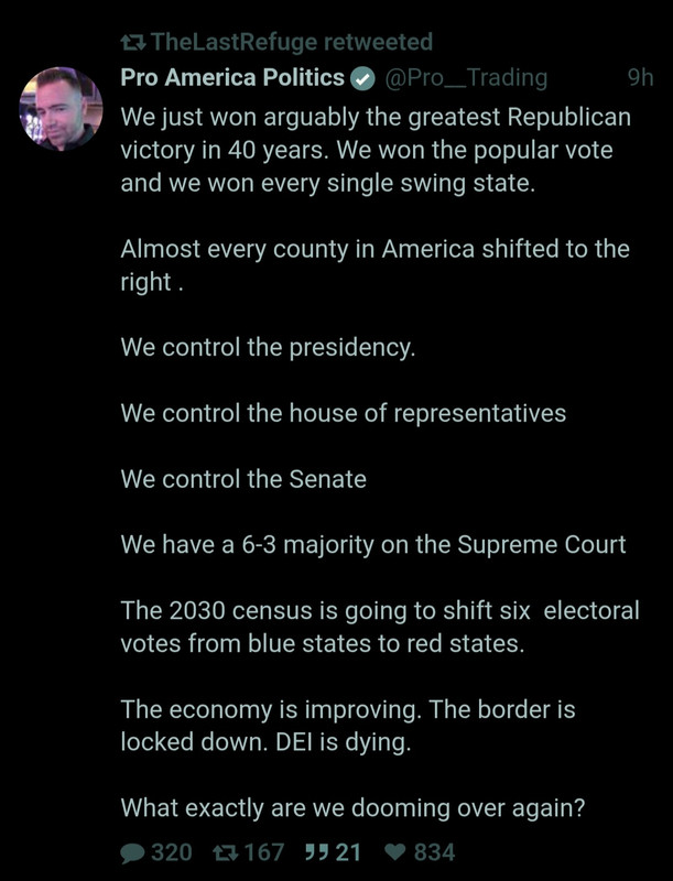 Sorry, I guess I’m just one of those doomers but whoever that Pro_Trading person is certainly wasn’t paying attention to the results of last week’s elections.