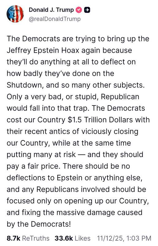 FTA “Democrats just proved they never cared about Jeffrey Epstein transparency. They only care about attacking Donald Trump.