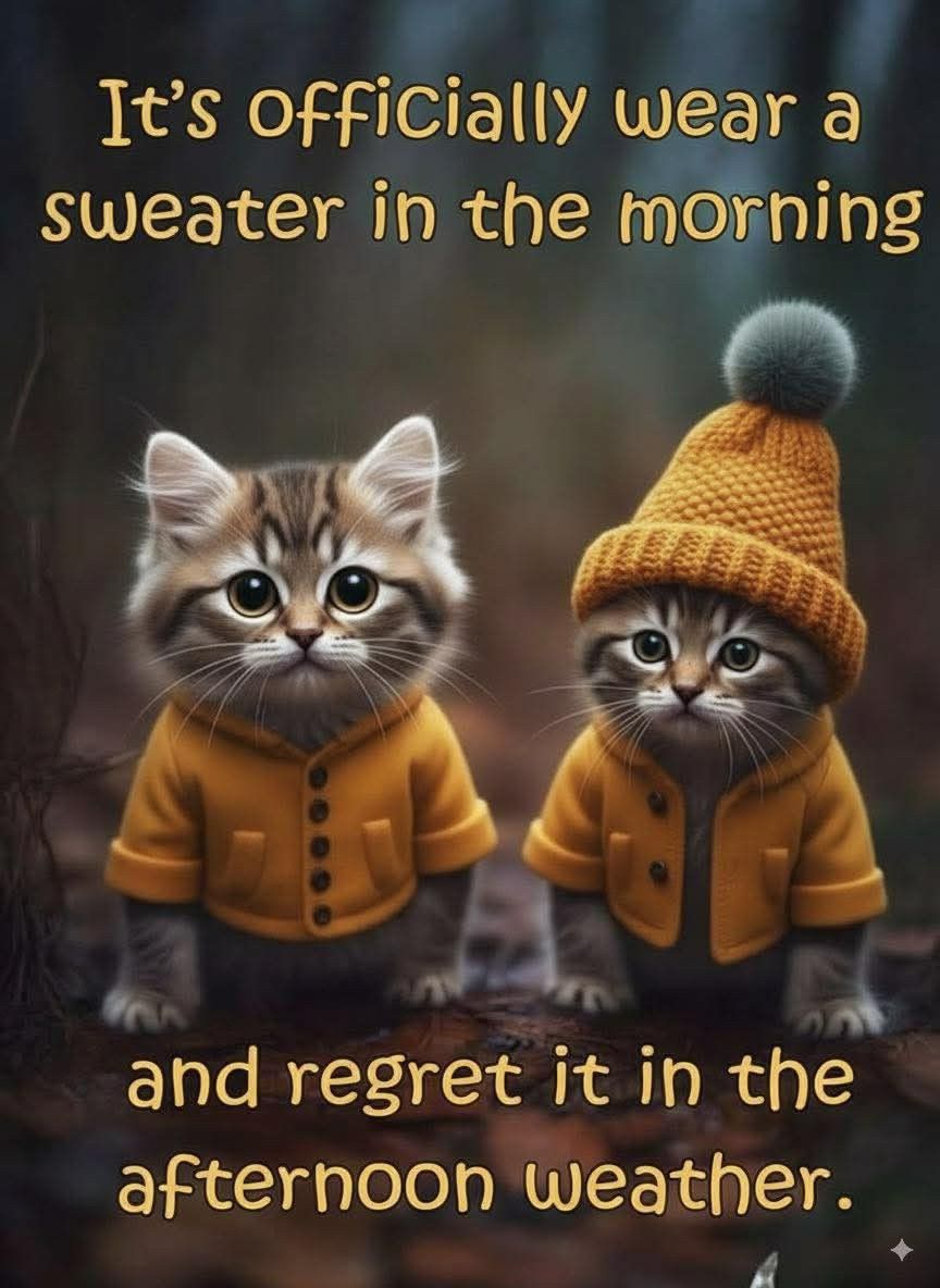 The sweater cats are cute too and yes that is Texas weather. Heat in the morning, air conditioning in the afternoon. It is currently 84 here according to the weather app on my phone.