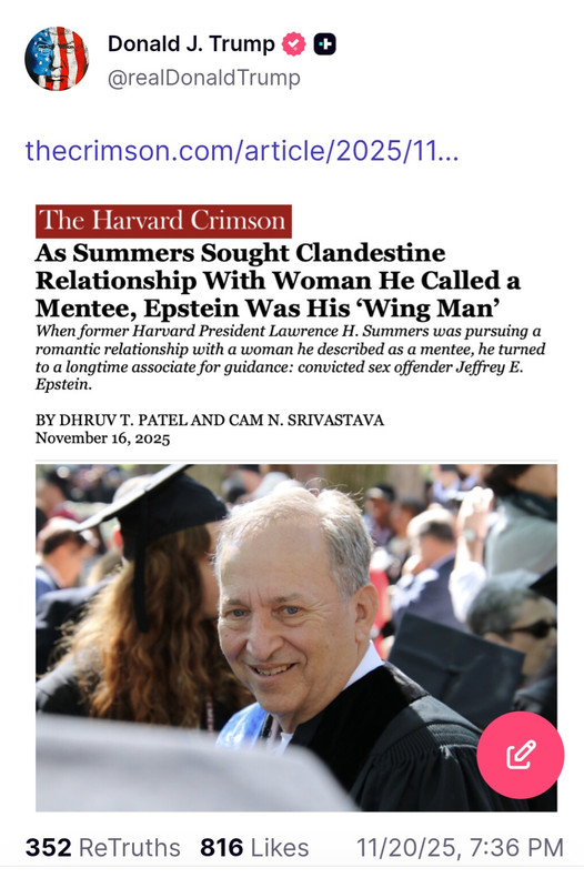 ://www.thecrimson.com/article/2025/11/17/summers-epstein-wing-man-woman-described-as-mentee/ https://truthsocial.com/@realDonaldTrump/115584885635553401