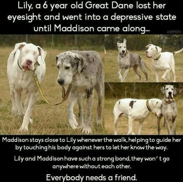 Love the story of the blind Great Dane with his own guide dog Maddison. The picture of the Grandmother feeding the dog with her fork is a kick!
