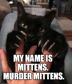Like Tinkster, Harry Houdini the Maine Coon, is resting on my shoulder purring away. He takes his paw and gently rubs my face and gives kisses on my cheek. His favorite is to put his paw under my chin, to turn my head towards him, so he can “kitty kiss” my nose. He’s so very polite… but I must make sure the murder mittens are gently trimmed… else his declarations of devotion and love can become quite dangerous.