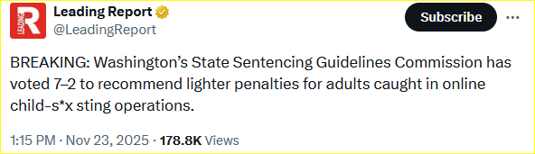 NEW: Washington’s State Sentencing Guidelines Commission voted 7 to 2 to endorse a proposal that would reduce penalties for adults arrested in online child abuse sting operations. Unbelievable.