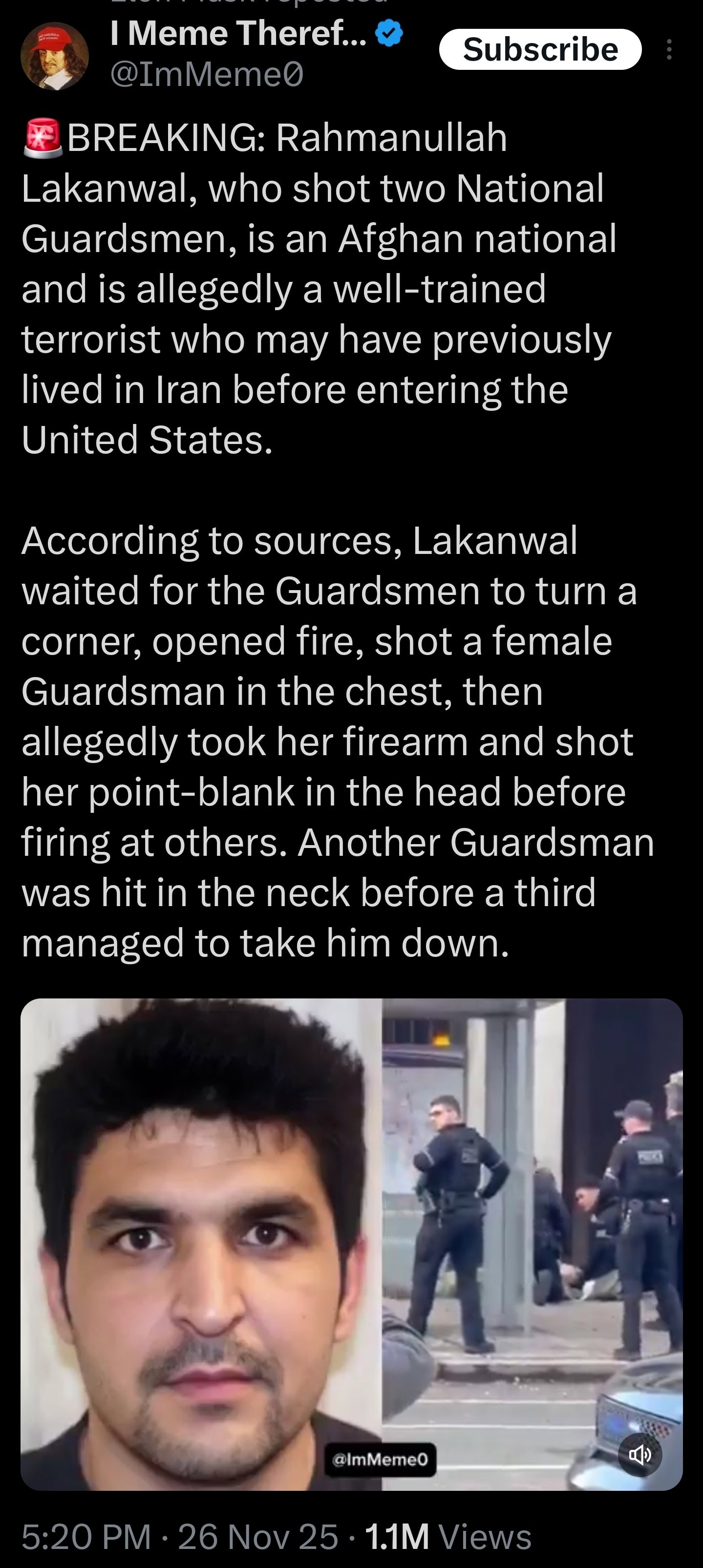 I woke up this morning and the first thing I thought of were the two National Guard TROOPS in the hospital. Haven’t seen any word yet how they are doing . LORD , please watch over them! That Afghan POS…….id rather not say what I wish for him/it! At best, this is a wake-up call for the Guard and LEOs everywhere. During my time as a CDL instructor, I learned my lesson with those people. Not a one of them can be trusted Hope everyone has a nice Thanksgiving ! GOD bless America, May he protect our TROOPS and Please pray for PRESIDENT Donald J Trump