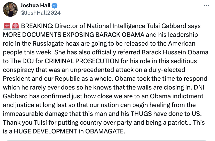 Yet another serving on a silver platter from DNI Gabbard to Scammy’s Jo’s DOJ. Go get ’em Scammy!