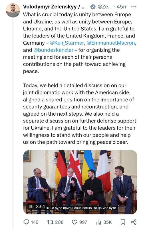 Meanwhile, Volodymyr Zelenskyy is traveling around Europe stopping for tea and crumpets with Macron, Starmer and Merz in London today. Think about the upside-down priorities here.