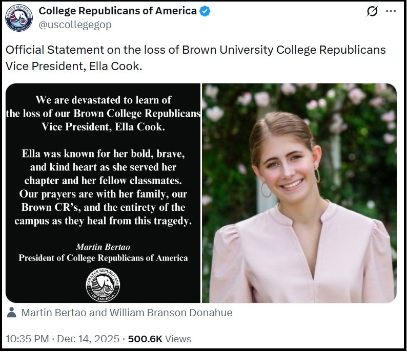 It seems to me the target was Ella Cook, a strong Conservative, who had a lot of influence with young college students. I see a pattern, like Charlie Kirk – they must be silenced one way or the other. Then you get the Australian PM blaming guns and the “far right” for the terrorist attack there.