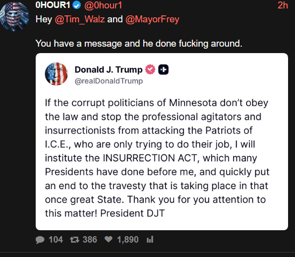 Walz and Frey had better get the chaos under control FAST. They will not enjoy it when President Trump invokes the Insurrection Act.