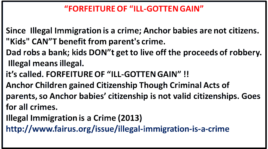 Check out Forfeiture of ill-gotten gains! A good % of illegals actually use the birth of a child on America soil to stary in America & collect Welfare benefits.
