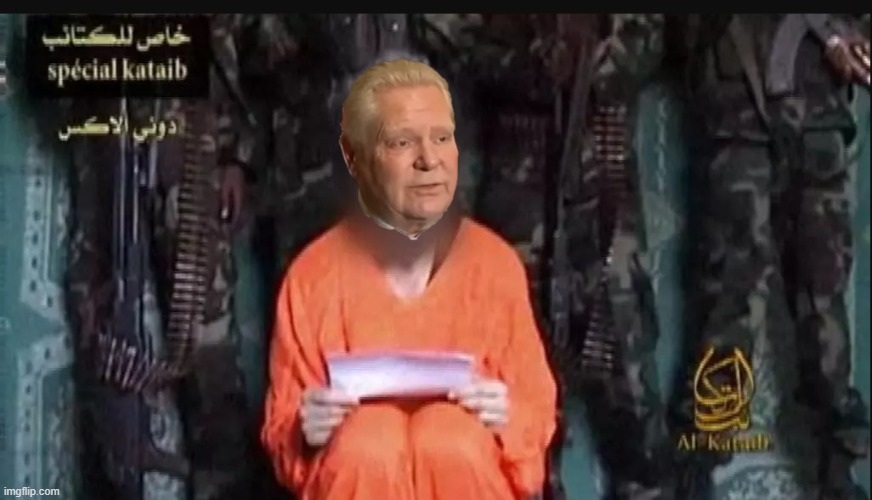 Ontario Premier Doug Ford went for a pizza with Canadian Prime Minister Mark Carney.  Following the meeting Doug Ford appears on camera for a debrief to explain how he has reversed his opposition to Chinese EV imports.  The presser looks like a hostage video (prompted):