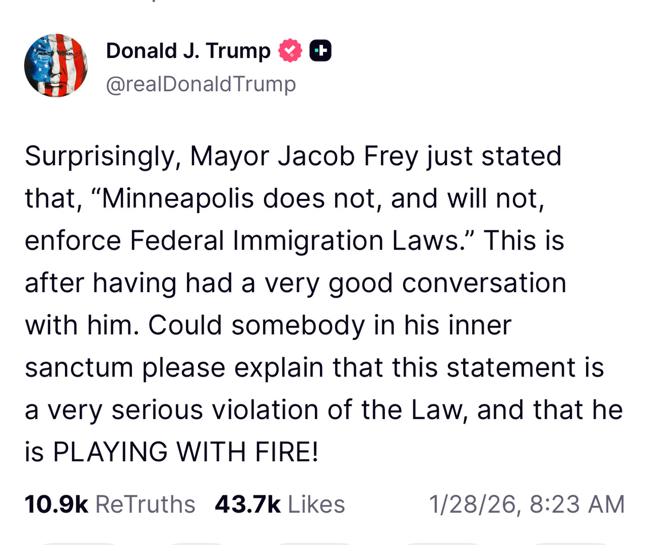 If only we could get Truth Social postings this spicy about Minnesota or practially anthing happening in our own country. Your voters live in the U.S.A. Mr. President.