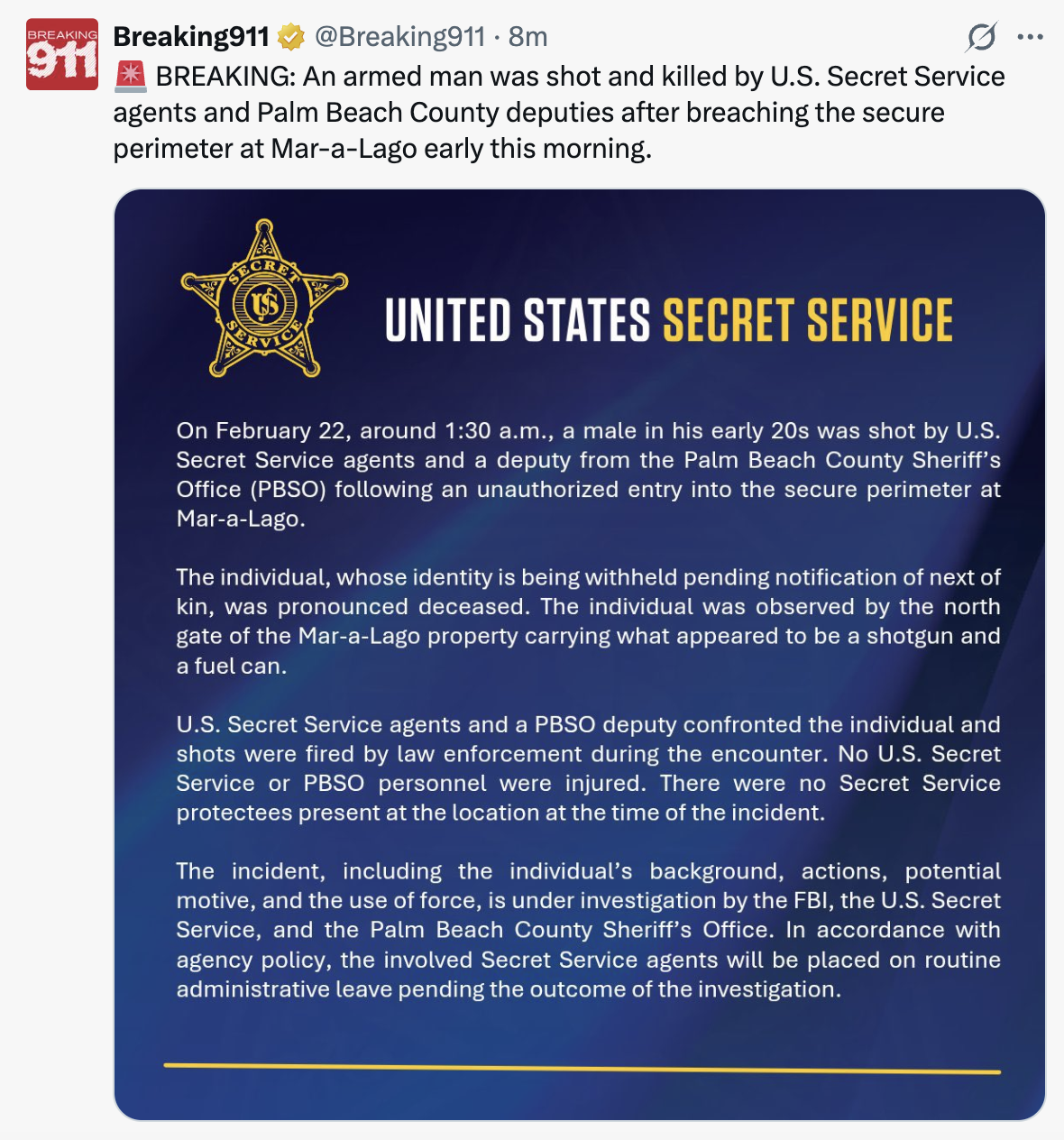FTA “An armed man was shot and killed by the Secret Service in the early hours of the morning after unlawfully entering the secure perimeter at Donald Trump‘s Mar-a-Lago in Florida. The white male, in his early 20s, was holding a shotgun and a fuel can as he tried to enter Trump’s Palm Beach residence near the north side around 1.30am on Sunday, the Secret Service said.President Trump and First Lady Melania Trump were in Washington, DC, last night attending the Governors Dinner. Two Secret Service agents and one deputy from the Palm Beach County Sheriff’s Office ordered him to drop his weapons. ‘They confronted a white male that was carrying a gas can and a shotgun. He was ordered to drop those two pieces of equipment that he had with him,’ Sheriff Ric Bradshaw said at a press conference Sunday morning. The suspect put down the gas can, but raised his gun into shooting position, prompting police to fire.