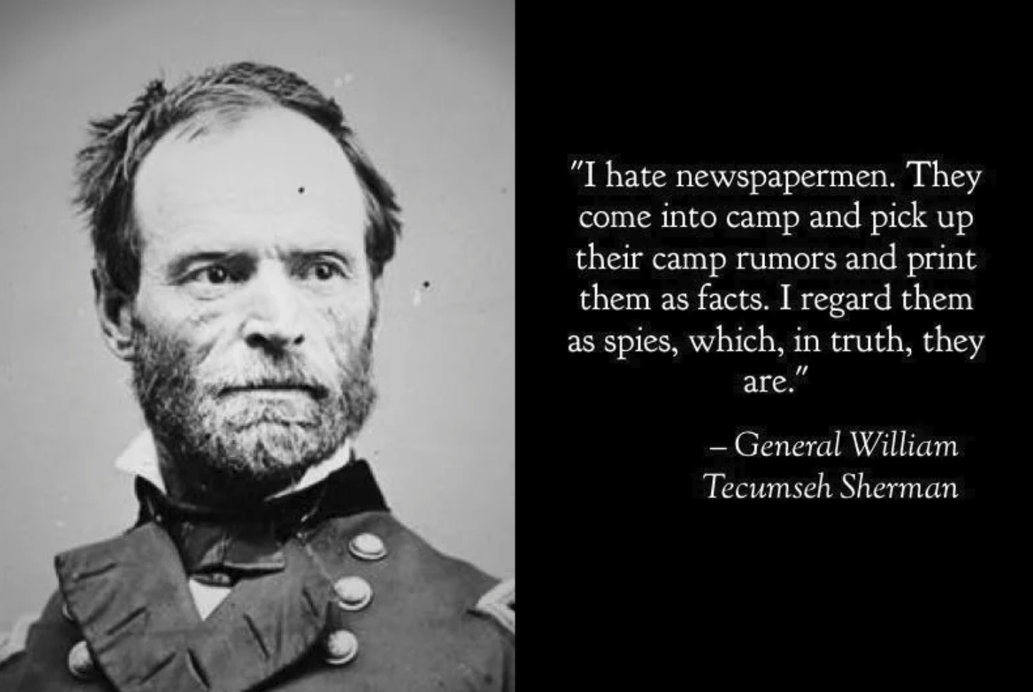 That’s why A. Lincoln shut down over 300 northern newspapers who weren’t supporting his war effort, looks like Uncle Billy had them pegged, too.