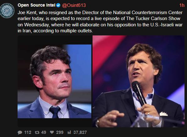 Kent, a senior deputy to Director of National intelligence Tulsi Gabbard posted his resignation letter on the X platform, writing: “I cannot in good conscience support the ongoing war in Iran.” … “Iran posed no imminent threat to our nation, and it is clear that we started this war due to pressure from Israel and its powerful American lobby.”