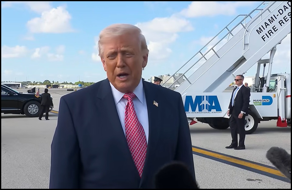 Arriving in Miami for a speech to the Future Investments Initiative forum, President Trump pauses to answer questions from the assembled press pool. WATCH: