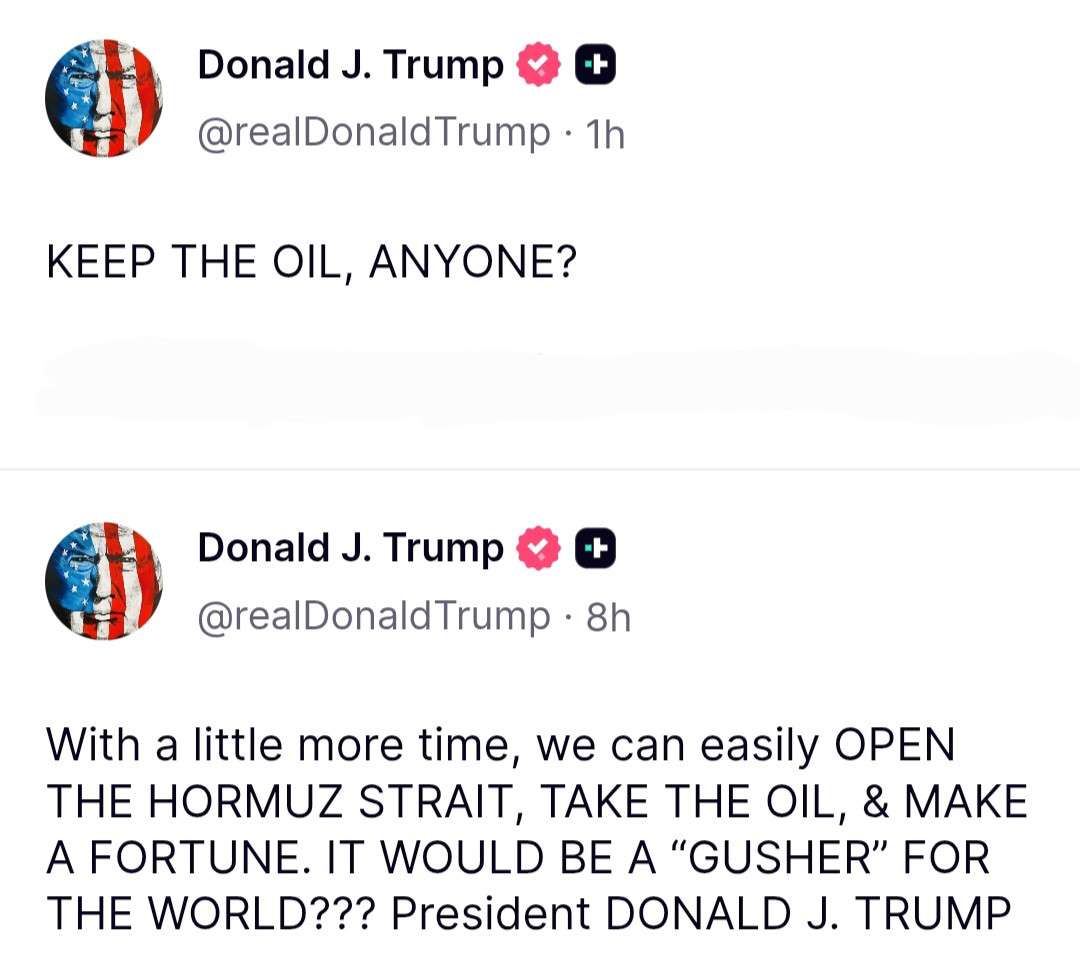 With a little more time, we can easily OPEN THE HORMUZ STRAIT, TAKE THE OIL, & MAKE A FORTUNE. IT WOULD BE A “GUSHER” FOR THE WORLD??? President DONALD J. TRUMP