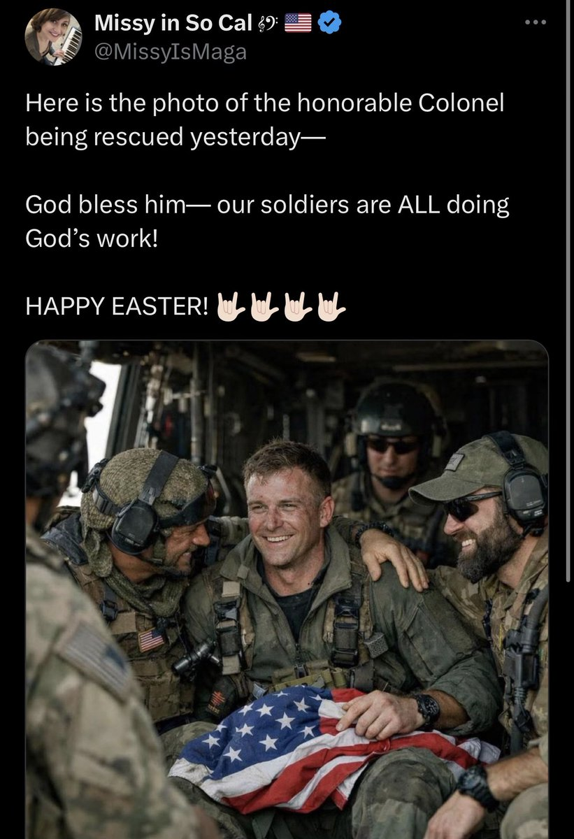 “The rescued F-15 crew member said “God is Good” over his radio after ejecting from the aircraft over Iran, according to Axios.”….