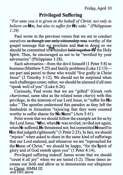 Our Father, who art in heaven, hallowed be thy Name. Thy kingdom come. THY WILL BE DONE, on earth as it is in heaven. Give us this day our daily bread. And forgive us our trespasses, as we forgive those who trespass against us. And lead us not into temptation, but DELIVER US FROM EVIL.