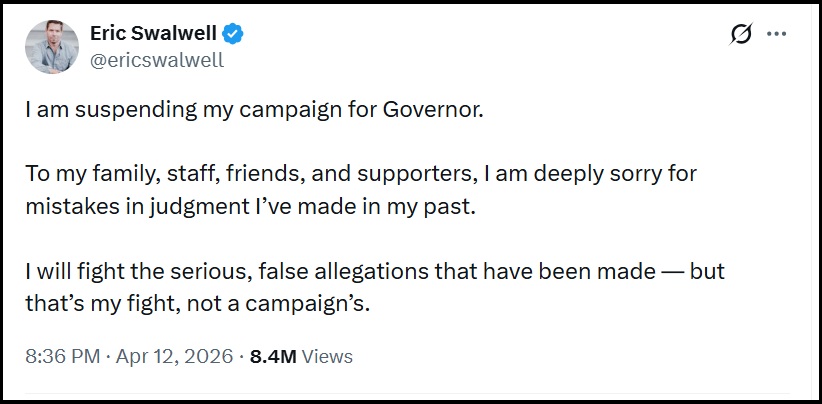 Swalwell did not announce an exit from Washington DC, or a resignation from his position as congressman. Therefore, it would appear that rape and sexual assault are disqualifiers for Governor, but for a DC Democrat congressman, deviant and exploitative conduct is standard.