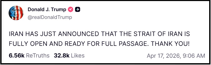 “THE STRAIT OF HORMUZ IS COMPLETELY OPEN AND READY FOR BUSINESS AND FULL PASSAGE, BUT THE NAVAL BLOCKADE WILL REMAIN IN FULL FORCE AND EFFECT AS IT PERTAINS TO IRAN, ONLY, UNTIL SUCH TIME AS OUR TRANSACTION WITH IRAN IS 100% COMPLETE. THIS PROCESS SHOULD GO VERY QUICKLY IN THAT MOST OF THE POINTS ARE ALREADY NEGOTIATED. THANK YOU FOR YOUR ATTENTION TO THIS MATTER!” ~ PRESIDENT DONALD J.TRUMP