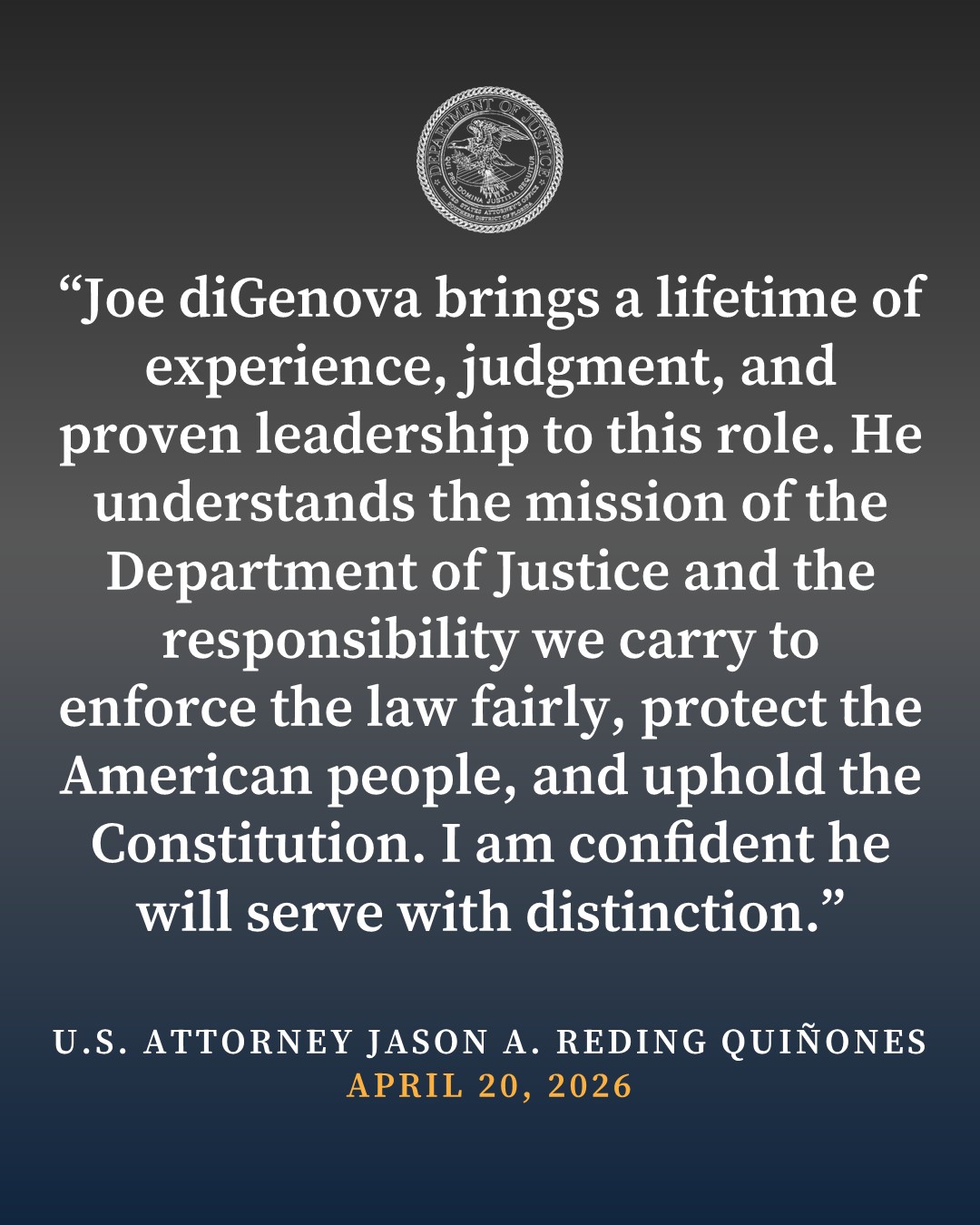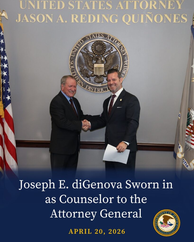 “Joseph E. diGenova has been sworn in as Counselor to the Attorney General at the U.S. Department of Justice, stepping into a senior advisory role on key legal, policy, and enforcement matters. With decades of experience—including serving as U.S. Attorney for D.C. under Ronald Reagan—diGenova brings deep expertise in federal prosecution and high-stakes investigations. Praised by U.S. Attorney Jason A. Reding Quiñones for his leadership and judgment, he will help advance the Department’s mission to protect Americans, enforce the rule of law, and ensure impartial justice.” (SOURCE)