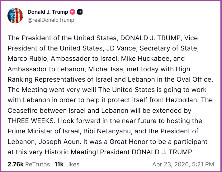 President Trump posted news of the extension on Truth Social following a meeting at the White House that included “high ranking” representatives from Israel and Lebanon in addition to Vice President Vance, Secretary of State Marco Rubio, U.S. Ambassador to Israel Mike Huckabee and U.S. Ambassador to Lebanon Michel Issa. “I look forward in the near future to hosting the Prime Minister of Israel, Bibi Netanyahu, and the President of Lebanon, Joseph Aoun. It was a Great Honor to be a participant at this very Historic Meeting!” [SOURCE]