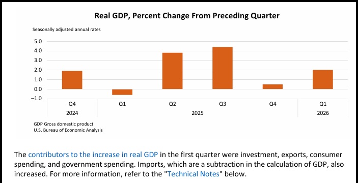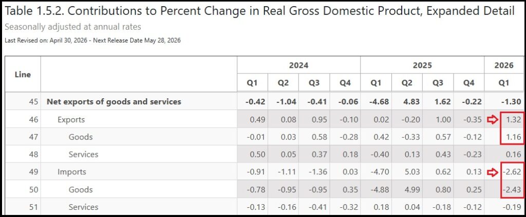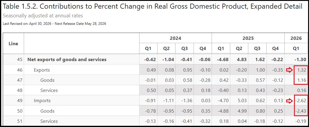 ♦ The first quarter Gross Domestic Product (GDP) was released by the Bureau of Economic Analysis (BEA) [DATA HERE] The first estimate is for growth at 2.0 percent. At first glance that is lower than we expected; however, a deeper look shows a large increase in imported goods that are deductions to the equation. The imported goods increased 25.8% more than the fourth quarter of 2025 [Table 1.1], that led to a net -1.30 percent deduction [Table 1.5].